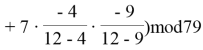 – p — простое число, которое является порядком конечного поля, то есть поля, элементами которого являются целые числа 0, 1, 2,…, p-1, а все математические операции в этом поле производятся по модулю p. Пусть в нашем случае p=79.