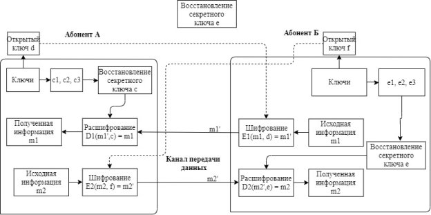Предположим, что абонент А хочет передать информацию абоненту Б. Для этого он с помощью функции E2 шифрует данные, входными параметрами этой функции являются передаваемая информация m2 и открытый ключ абонента Б — f. На выходе функции E2 получаем шифротекст m2’, который передаётся абоненту Б. Расшифровка полученной информации осуществляется при помощи функции D2, входными параметрами которой являются полученный шифрованный текст m2’ и секретный ключ абонента Б — e. На выходе функции D2 получаем исходную передаваемую информацию m2. Аналогично происходит передача информации от абонента Б абоненту А.