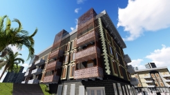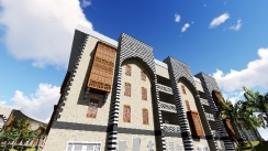 Комплекс имеет общий уровень, дополнен выступами «Аблак» и лестничными клетками. На фасадах отражаются три цвета: черно- белый «Аблак», коричневый «Машрабия» и облицовочный известняк светло- коричневого цвета, также же серый цвет перегородок на кровле, и белая перегородка с узорным орнаментом на балконах. (Рис. 5)