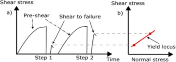 The two measurements stages per cycle, “pre-shear” and “shear-to-failure” are repeated two or more times at varying conditions to record necessary data for the analysis, obtaining the yield locus as an extrapolated line from the failure points. Two measuring cycles are shown in Fig. 1a) is shown the “pre-shear” at a pre-set maximum normal stress and the “shear-to-failure” stresses observed at 30 % and 80 % of this pre-set maximum normal stress. These “shear-to-failure” stresses are plotted to obtain the yield locus as it is shown in Fig. 1b). The yield locus then, is used to obtain the Mohr-Coulomb failure envelop providing the information of the unconfined yield strength and the maximum principal stress.