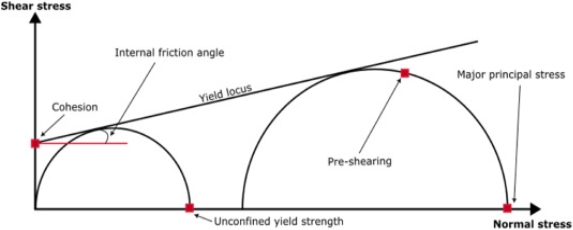 Once the yield locus is determined, the two semi-circles are calculated through distinct methods. The first semi-circle is defined as having a tangent to the yield locus and crossing the origin axes. The second intersection point along the normal stress axis corresponds to the unconfined yield strength, which represents the maximum principal stress that causes the bulk material in an unconfined state to fail under shear. The second semi-circle also has a tangent to the yield locus but intersects at the pre-shear measured stress. Here, the initial intersection point with the normal stress axis signifies the major principal stress. These two semi-circles are illustrated in Fig. 2.