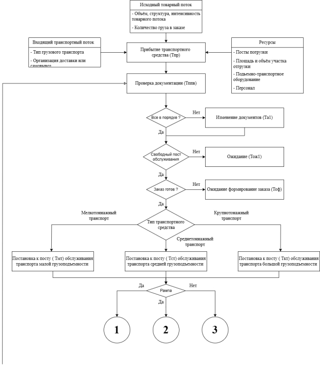 Рис. 2. Блок-схема технологического процесса складского комплекса при обслуживании автотранспорта прибывшего на пост обслуживания