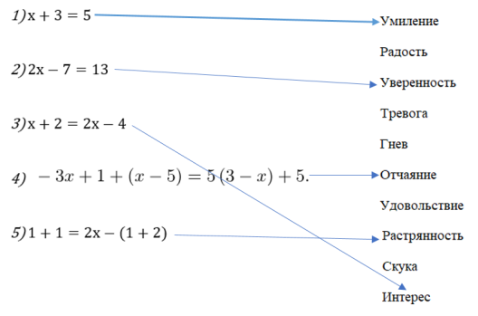 — Приём вовремя контроля знаний «Лестница эмоций» — способствует распознаванию видов эмоций. Учитель предлагает выполнить самостоятельную работу, состоящую из нескольких заданий. Затем, после решения, установить «стрелочками» соответствие с той эмоцией, которая наиболее близка к эмоциональному состоянию во время решения данного примера.