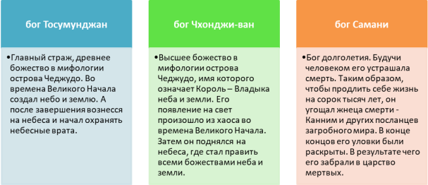 - Географический детерминизм в корейских мифах играет значительную роль, являясь шаманским пантеоном и местом обитания действий богов. Например, остров Чеджудо (Тамна) — обиталище богини земли Чачонби и сельского хозяйства. Этот остров смог сохранить свои уникальные верования и культуру, множество мифов о божествах.