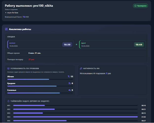 Вместо предоставления преподавателю громоздких текстовых транскриптов бесед ученика с YandexGPT, система делает ставку на количественные метрики. Модуль анализирует симптоматику затруднений, выводя на экран: количество затраченного времени на задачу, число совершенных попыток и факт использования ИИ-подсказок. Дополнительно внедрена античит-система, фиксирующая переключения контекста браузера (счетчик «Покидал вкладку»), что позволяет идентифицировать попытки несанкционированного поиска ответов в сети.