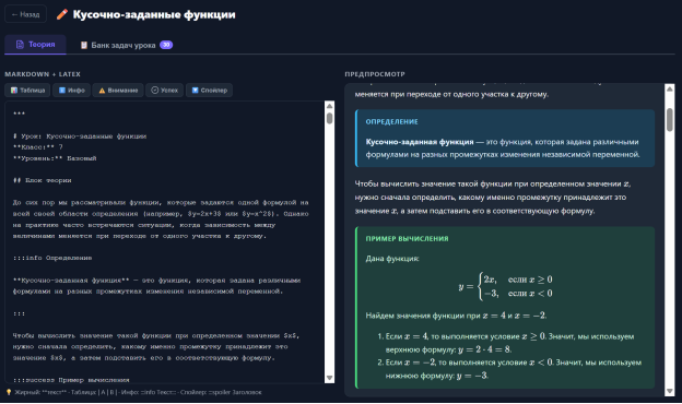 - Пользовательские шаблоны: ручное создание уникальных вариантов через встроенный Markdown-редактор, поддерживающий рендеринг математических формул и предпросмотр в реальном времени.