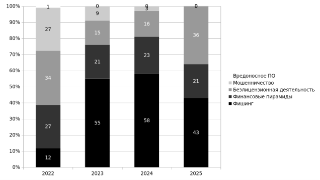 На рисунке 1 представлены информационные ресурсы, которые были созданы злоумышленниками и по которым Банк России принял меры по прекращению деятельности. Из статистики видно, что распространение вирусного программного обеспечения (ПО) и простое мошенничество перестают быть популярными и эффективными. Уровень защищённости информационных систем достиг такого состояния, при котором создание вредоносного ПО целесообразно только с предельными способностями преступной организации по нарушению информационной безопасности. А к обычному мошенничеству население уже адаптировалось и его заместила более изобретательная схема − социальная инженерия и связанный с ней фишинг. Каждая из трёх стратегий, оставшихся к 2025 году, использует не столько технические уязвимости, сколько нацелено на неосторожное или целенаправленное поведение человека. Таким образом злоумышленники стимулируют человека выйти за пределы защиты существующей информационной системы. Это приводит не только к финансовым потерям, но и к снижению доверия к информационной системе, так как в таких случаях возместить потери не предоставляется возможным.
