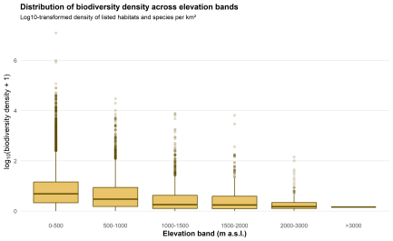 Biodiversity density complicates the picture, and usefully so. Mean density is highest in the lower classes: 840.0 in the 0–500 m belt, 56.0 in 500–1000 m, 41.3 in 1000–1500 m, 33.7 in 1500–2000 m, and 3.38 in 2000–3000 m. At first this seems at odds with the rise in mean biodiversity value. It is not. Lowland values reflect many small sites with relatively high biodiversity content per square kilometre, whereas high-elevation sites are often much larger. Their biodiversity value is high in absolute and mean site terms, but once divided by area, density falls.