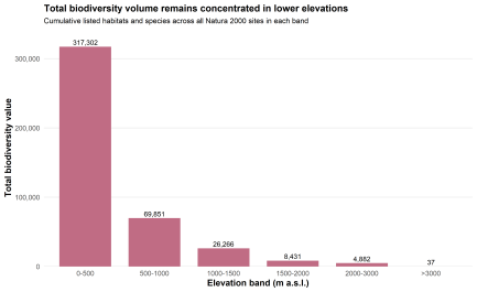And yet the article does not end there. Once biodiversity is aggregated rather than averaged, the picture shifts. The 0–500 m class contributes a cumulative biodiversity value of 312,763, whereas the 2000–3000 m band contributes 5,992. Lowlands contain far more Natura 2000 sites — 20,457 against 192 — and for that reason they hold the largest total biodiversity volume even while their average site-level biodiversity value remains lower.