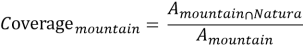 where A Natura is the total Natura 2000 area and A EU is the total analytical area of the EU. Mountain coverage was defined as: