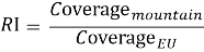 An RI greater than 1 indicates that mountain areas are overrepresented relative to the EU average, whereas an RI below 1 would indicate underrepresentation. In the final results, Coverage EU equalled 34.7 %, Coverage mountain reached 59.5 %, and the resulting RI was 1.72. Those figures belong to the Results section analytically, but it is useful to state them here once because they clarify what the metric actually measures.
