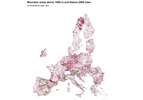 Mountain areas were defined as land above 1000 m a. s.l. No single threshold is perfect across a continent as varied as Europe, and a mountain in Scandinavia does not begin under exactly the same ecological conditions as a mountain in the Mediterranean. Still, 1000 m provides a workable continental approximation: high enough to separate clearly elevated terrain from most lowland and foothill landscapes, but broad enough to retain a meaningful mountain domain for comparison.