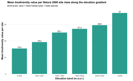 The elevational picture becomes more revealing once site-level biodiversity is added. Mean biodiversity value per Natura 2000 site, defined as the sum of listed habitat types and listed species, rises from 15.3 in the 0–500 m class to 19.2 in 500–1000 m, 25.1 in 1000–1500 m, and 27.4 in 1500–2000 m. The highest mean value is recorded in the 2000–3000 m band, where it reaches 31.2. Above 3000 m, the value drops to 4.0, though this class contains only one site and is not structurally comparable to the others. That increase is not trivial. Between the lowest band and the 2000–3000 m class, mean biodiversity value more than doubles. The elevational gradient is therefore not confined to territorial coverage. It is reflected, quite clearly, in the biodiversity content of Natura 2000 sites themselves.