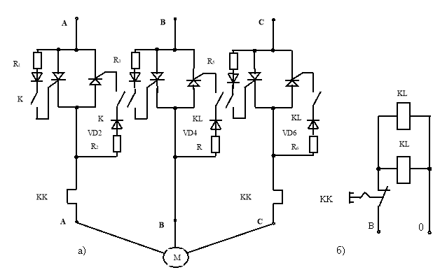 Одним из таких устройств является бесконтактный пускатель на базе тиристоров. Электрическая схема такого пускателя представлена на рис.1.