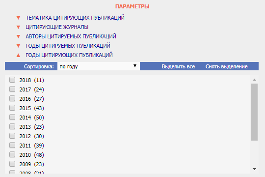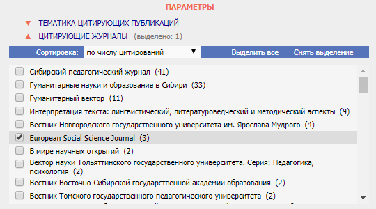 В первую очередь, можно указать возможную тематику, выбрав один или несколько пунктов. Рядом с каждым из них указывается количество подходящих под фильтр вариантов. Тематики можно отсортировать как по количеству цитирований, так и по алфавиту.