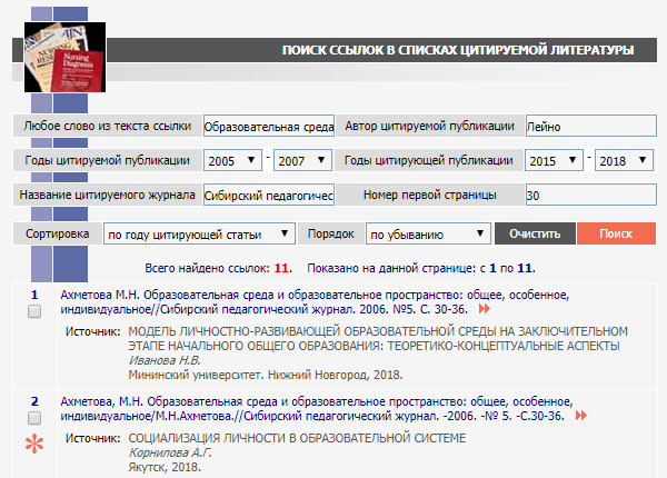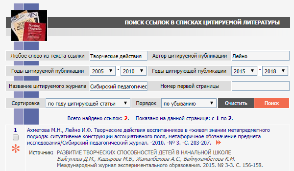 Также можно прописать временные рамки, причем как для публикации, которая цитируется, так и для работы, в которой имеется отсылка к труду автора. Чтобы дополнительно сузить поле поиска, можно прописать название журнала и даже указать страницу, начиная с которой необходимо просматривать его содержимое. Результаты показываются в том же формате, что и для списка цитирований: выводятся сведения о работе автора и информация о публикации с цитатой.