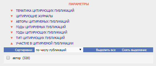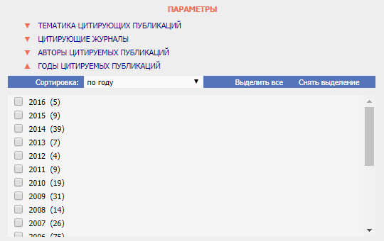 Отдельно можно настроить вхождение различных источников в список цитирований при помощи параметра группировки. Если соответствующая галочка на форме отключена, то в перечень войдут все обнаруженные публикации.