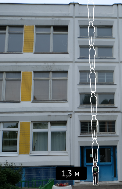 2. Сделаем фотографию ребенка на фоне школы. Рост ребенка равен 1,3 м, его рост на фотографии — 2 см, высота школы на фотографии — 15,7 см. Определим реальную высоту школы: 1,3 × 15,7 / 2. В этом случае высота школы равна 10,2 м.