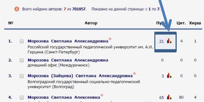 4. На странице с результатами поиска нажмите на диаграмму рядом с количеством публикаций автора