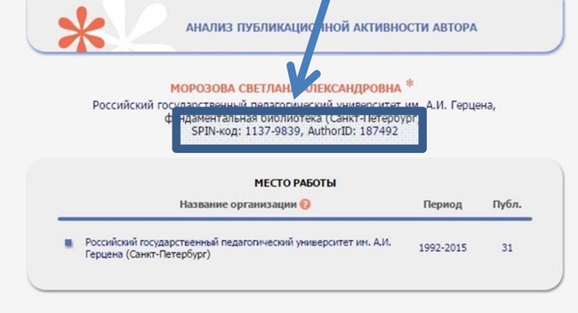 5. SPIN‐код автора и Author ID указаны в верхней части страницы под фамилией и местом работы автора