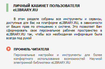 Полные тексты в Научной электронной библиотеке можно просматривать только после создания учетной записи eLIBRARY.RU. Это правило действует как для распространяемых по подписке материалов, так и для документов, выложенных без ограничений для всех пользователей. Кроме того, после регистрации можно пользоваться расширенными функциями библиотеки: объединять статьи и журналы в подборки, просматривать историю поиска, изменять навигационную панель и так далее.