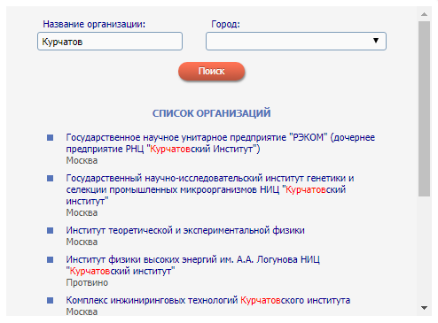 Выбор можно существенно сузить, если указать город, где находится искомая организация.