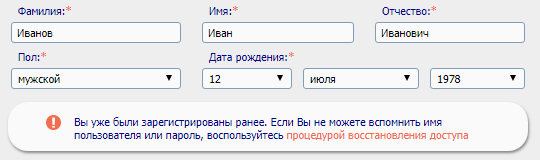 5. Система автоматически проверяет вводимые данные и сравнивает их с информацией о зарегистрированных пользователях. Если обнаруживается совпадение, то есть ранее по Вашим данным уже была совершена регистрация, но вспомнить пароль/логин Вы не можете, попробуйте восстановить доступ к платформе.