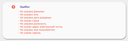 Уже на этом этапе система выполняет ряд проверок. Вместо регистрации система сообщит об ошибках, если в какие-либо поля были введены недопустимые значения или если обязательные поля остались незаполненными. Анкета показывается еще раз, чтобы можно было повторить ввод данных. Требующие внимания ошибки указываются красным цветом в самом начале формы.