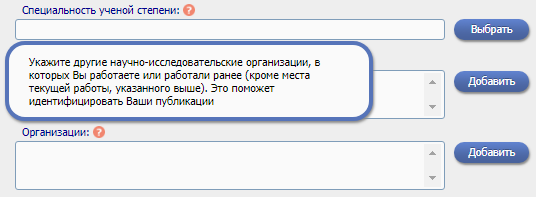 2. Если Вы уже публиковали материалы на предыдущих местах работы, нужно перечислить эти организации в специальном поле. Обратите внимание, что дублировать основное место работы не нужно.