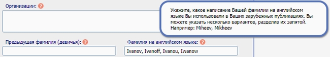 6. Специальное поле в заключительной части анкеты выделено под возможное написание Вашего имени на английском языке. Система предложит свой вариант написания, основываясь на введенных имени и фамилии и общих правилах транслитерации. Вы можете исправить его или же указать другие варианты, которые Вы использовали для подписи в своих публикациях. Можно вводить несколько вариантов, разделяя их запятыми. Впоследствии данные из этого поля система будет использовать для сопоставления публикаций из зарубежных изданий.