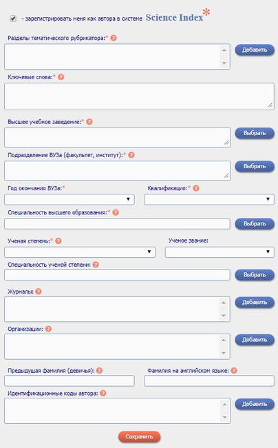 Чтобы открыть дополнительные поля, нужно пометить галочкой строку о регистрации на платформе SCIENCE INDEX.