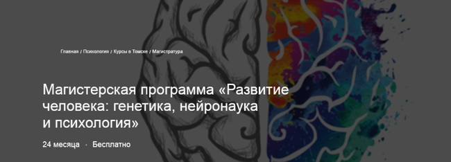 Томский государственный университет предлагает обучение по магистерской программе «Развитие человека: генетика, нейронаука и психология», в количестве 10 бюджетных мест на 2018/2019 учебный год. Конкурс на данное направление, думаю, большой, но стоит попробовать, программа обучения обещает быть очень интересной! Она предоставляет магистрантам ресурсы и возможности для изучения основ целого комплекса наук, важных для понимания развития человека, включая психологию, генетику, нейронауку и др. С целью интеграции выпускников в мировое научное пространство обучение проходит на английском языке. При этом предусмотрены различные организационно-методические формы сопровождения образовательного процесса на русском языке. Программа обладает уникальными особенностями: междисциплинарной научной коммуникативной средой, привлечением к реализации программы ведущих российских и зарубежных ученых, научно-исследовательской работой и практикой на протяжении всего периода обучения в магистратуре, инфраструктурой научно-исследовательской работы, участием в масштабных кросс-культурных проектах. Мне кажется, если бы я не обучалась уже в психолого-педагогической магистратуре Дальневосточного федерального университета, то попробовала бы подать документы на это интереснейшее направление!