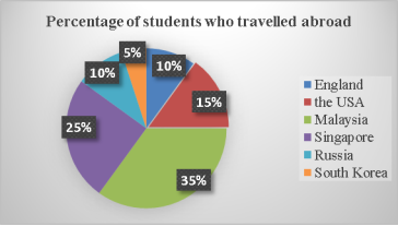 All the respondents gave answers and commented on the questions afterwards. The majority of the respondents visited Malaysia on academic purposes, about 35 % of the interviewees. Many of NIS Pavlodar students visited Singapore and participated in language courses. 15 % of the respondents went to the USA to develop leadership skills and enhance language skills. Equal number of the students that is 10 % visited Russia and England to learn more about scientific projects and improve their level of English. 5 % of the respondents visited South Korea and explored more on Science (See the graph 1).